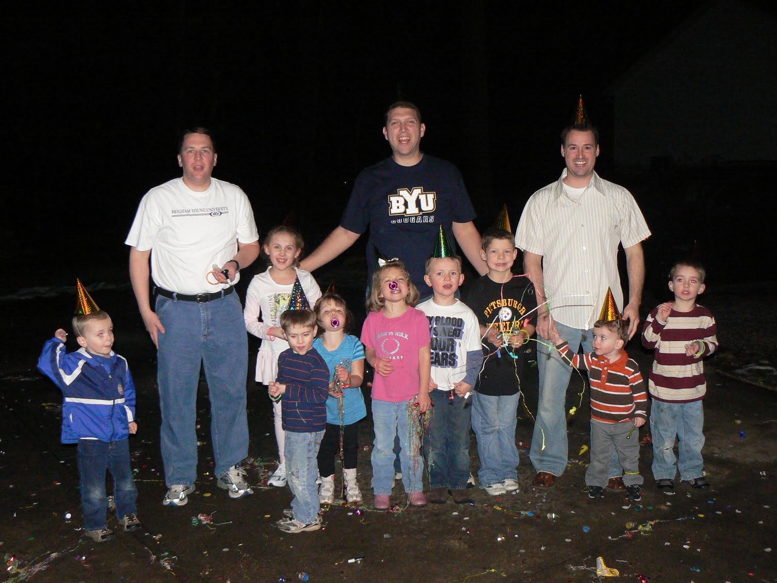 We did a little New Year's Eve party. Kids ran around inside; adults played games; everyone ate! We decided that 8 o'clock would be our celebration time, but we weren't completely ready. SO - we celebrated about 8:07! Happy New Year! I bought hats and blowers. Andy bought poppers; here he's teaching the kids how to use them.